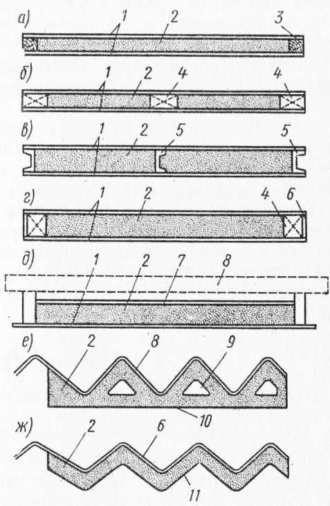 При проектировании трехслойных панелей с разными обшивками особое внимание необходимо уделять проверке напряжений и деформаций, вызванных температурно-влажностными воздействиями (см. главу 5). В качестве среднего слоя применяются преимущественно пенопласты беспрессового изготовления (полистирольные, фенольные), вспениваемые в полости панели, а также в виде готовых блоков на полный размер панели. Применяются также сотопласты, соты из древесноволокнистых плит, пеностекло, пенопласты прессового изготовления. В случае применения гофрированной обшивки с высотой профиля более 3 мм для среднего слоя можно применять только пенопласты, получаемые методом приформования или вспенивания в полости панели.