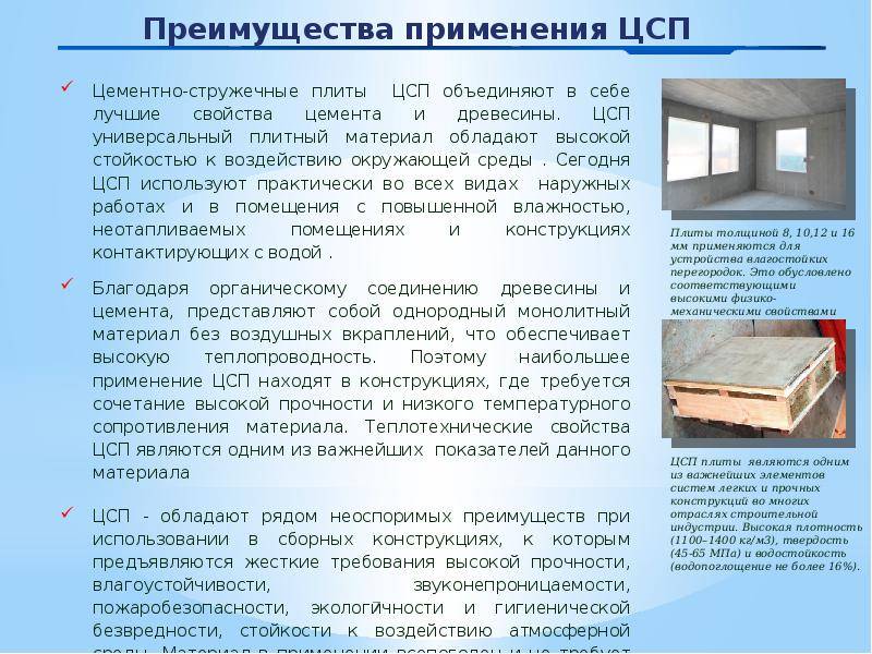 Данный стройматериал является крайне прочным, дышащим, негорючим, не пропускает звук, водостойкий и практически не возможно гниение. Он подходит для внешней и внутренней облицовки помещений, стен, потолков, полов, основа под кровлю.