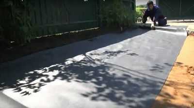 6) Укладка геотекстиля. После выравнивания и трамбовки щебня укладывается геотекстиль. Это долговечная прочная ткань, состоящая из полиэфирных волокон. Она выполняет две основные задачи: 1) не дает возможность сорнякам выбраться наружу через щебень, 2) не допускает оседание и вымывание песка и плодородной почвы. На фото можно увидеть, как производится укладка геоткани.