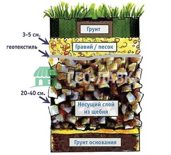- для средних нагрузок, углубление корыта будет 29-44 см (20-30 см слой щебня, 5-10 см слой песка и 4 см решетка),