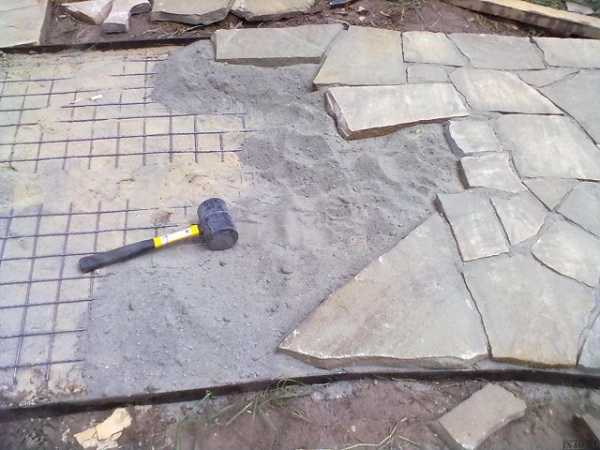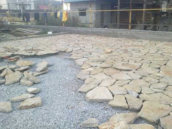 Клеевой раствор наносят на бетонную «подушку», а затем мозаикой укладывают на этот раствор природный камень.
