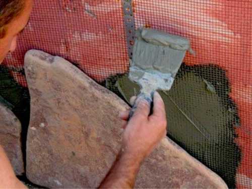 - Мокрый способ. Кладка на таком методе получается особо прочной и надежной. Идеально подходит для облицовки вертикальных поверхностей, позволяет возводить конструкции любой высоты и формы. При таком способе нет необходимости подгонять элементы по размерам – пустующее пространство заполнит клеевая смесь, а также накрепко соединит камни как с поверхностью, так и между собой. Здесь может использоваться песко-цементная смесь или плиточный клей.