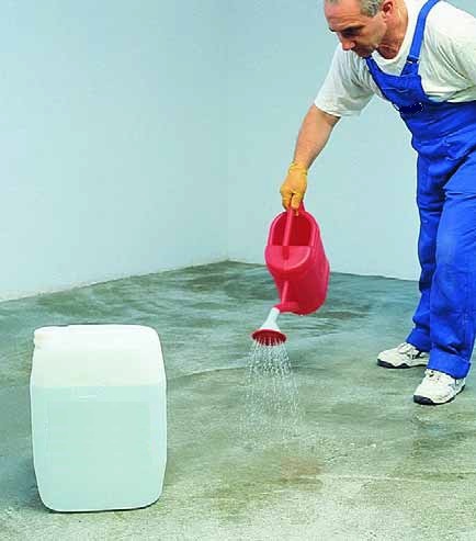 В отличие от топпинга, который наносят сразу после устройства стяжки, неорганические пропитки следует наносить через 10-14 дней после устройства бетонной стяжки. Перед нанесением пропитки бетонную поверхность очищают и шлифуют. Нанесение пропитки производится в два слоя.