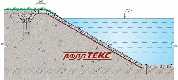 Для укрепления подтопляемых откосов, склонов георешетка заполненяется до уровня верхних вод (УВВ) гравием или щебнем.