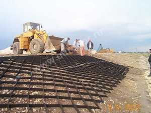 Слабые основания после укладки сетки обретают качество повышенной несущей способности. Материал изготавливается из полиэфирного волокна и обладает противоэрозионными качествами. Структура является трехмерной, за счет этого можно обеспечить удержание и укрепление грунта на наклонных поверхностях.