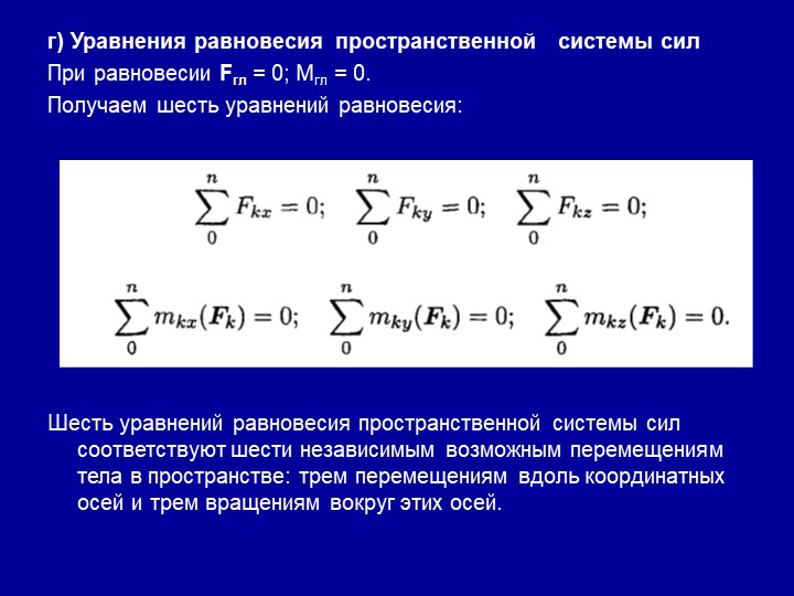- Для равновесия неконкурентной пространственной системы сил должны быть следующие уравнения равновесия: