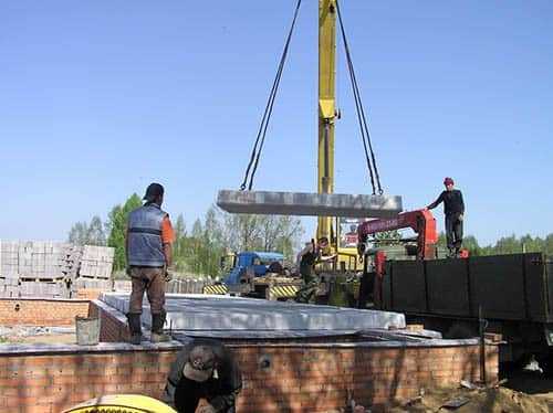 Перекрытие первого этажа обустраивается после того, как цоколь набрал прочность. Для этого берутся бетонные плиты с арматурой внутри.