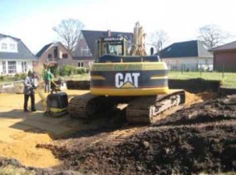 - На геотекстиль нужно уложить песчано-гравийную подушку слоем около 15 см. Обязательной проводится увлажнение и трамбовка материала.
