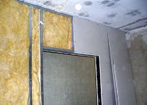 Чтобы гарантированно создать преграду для шума, рекомендуется выполнить укладку слоя минеральной ваты. Стена и так является хорошим препятствием для звуков, но внутренняя полость всё же способствует резонированию и их распространению. Заполнение изоляционным материалом будет дополнительно выполнять и теплоизоляционную функцию.Рекомендация! Укладочное размещение минеральной ваты удобнее выполнять после готовой обшивки одной стороны перегородки!