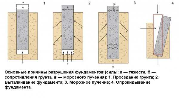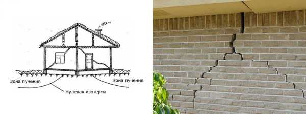 Давление при этом немалое – до 200 Мпа (более 3 тн/см2), а для того, чтобы вытолкнуть постройку из земли, часто достаточно и меньшего усилия. После весеннего таяния фундамент подвергается неравномерной просадке, на стенах дома видны глубокие трещины.
