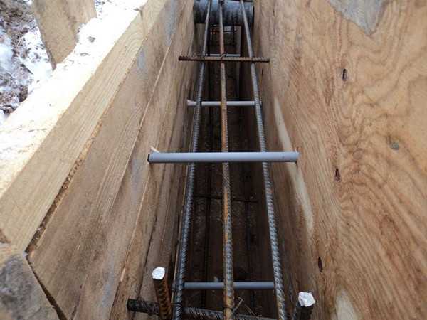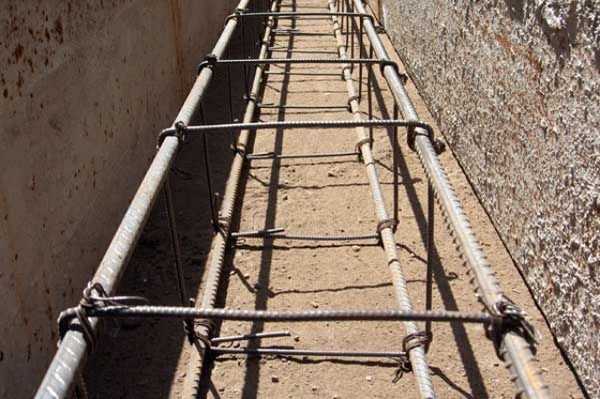 Как и в случае с углами, делается каркас. Готовые детали кладутся в траншею и привязываются к арматуре проволокой. Затем траншея заливается бетоном. Закончив с одним отрезком, приступайте к следующему и так весь периметр.