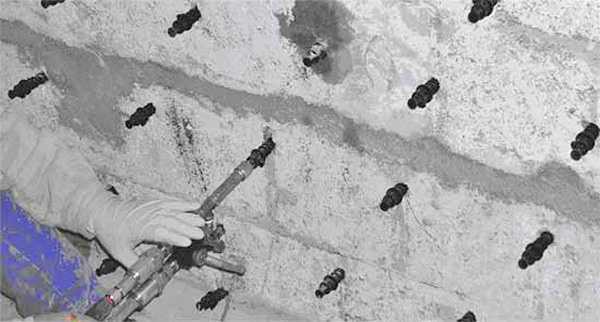 - Готовится жидкий раствор (соотношение воды и цемента — 0,9 к 1), которым заполняются каналы под давлением 0,2 МПа до отказа.