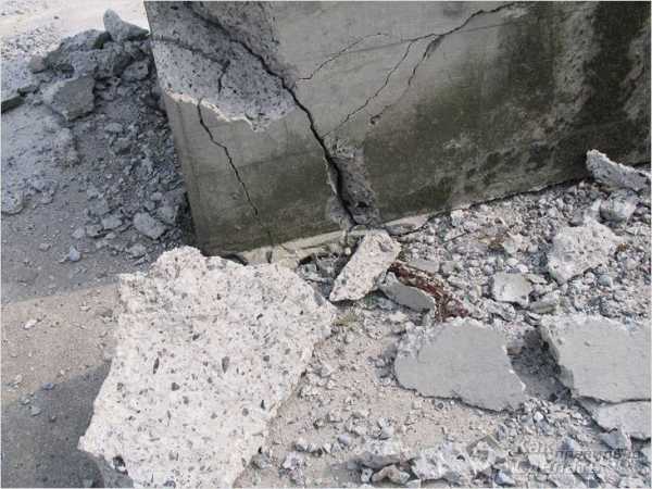 Если фундамент не углубился в землю (то есть его нижняя плоскость находится на одной линии с остальной частью фундамента), то, скорее всего, вы обнаружите разрушения в самом его «теле» (трещинки, углубления, ставшие видимыми арматурные каркасы и т.п.). Такой результат становится возможным в одном случае – фундамент подвергся долгому воздействию грунтовых вод и оказался не защищен от них.