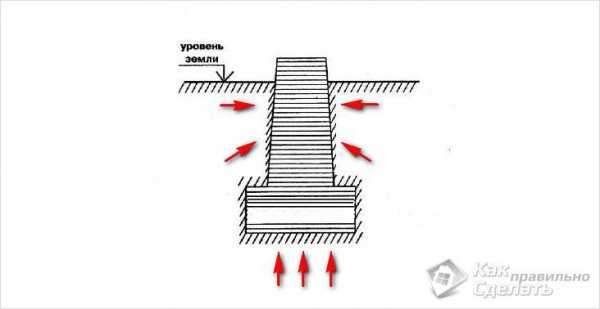 Кроме того, существует еще одна причина разрушения «тела» фундамента – вспучивание грунта. Происходит это следующим образом: если в вашей местности зимой земля промерзает на довольно большую глубину, а фундамент оказался не достаточно заглублен, то вода под его подошвой при понижении температуры превращается в лед. Как вы помните из школьных уроков, лед имеет больший объем, чем вода, находящаяся в своей жидкой форме. Поэтому частички льда начинают воздействовать на подошву фундамента, выталкивая ее вверх, а с другой стороны на фундамент давит вес здания. В итоге он не выдерживает такого сжимающего воздействия, чередующегося весной с оттаиванием грунта и образованием небольших пустот, в которые здание, под действием своего веса, начинает потихоньку проваливаться.