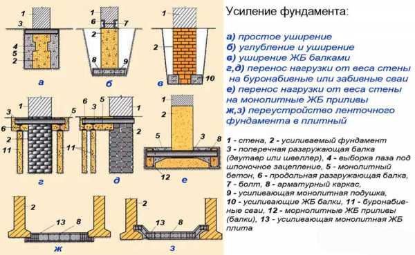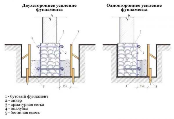 Существуют разные способы усиления всевозможных фундаментов. Например: