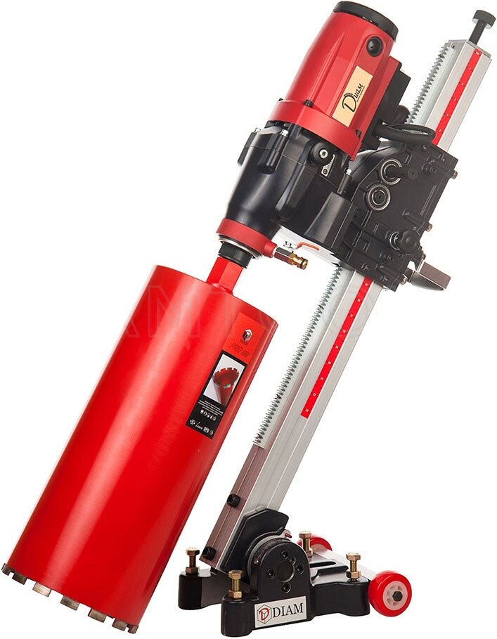 Двигатель с алмазной коронкой, которая внедряется вглубь материала, перемещается по направляющей стойке. На направляющей стойке располагается каретка с быстродействующим устройством крепления бурильного мотора и механизмом подачи (реечным, цепным или винтовым), обеспечивающим перемещение каретки вдоль стойки. От прочности и жесткости станины, а также надежности ее крепления во многом зависит точность и качество выполняемых отверстий, поскольку именно станина воспринимает немалые нагрузки, возникающие при бурении отверстий большого диаметра. Высота расположения отверстия и глубина сверления регулируются. Встроенные горизонтальный и вертикальный уровни, а также указатель центра отверстия обеспечивают высокую точность бурения.