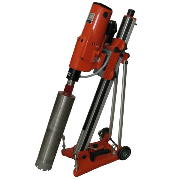 – мощность двигателя составляет порядка 1800 Вт, отверстия получаются диаметром до 130 миллиметров. Главное достоинство прибора – небольшая масса и разумная стоимость. Подходит тем, кому не нужно постоянно выполнять работы в больших объемах и слишком внушительного диаметра. Такие аппараты можно использовать без стойки при наличии второй ручки, но нужно соблюдать осторожность, так как это сокращает срок эксплуатации алмазной коронки и может стать причиной срыва сегментов.Установки со средней мощностью до 2500 Вт