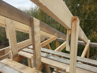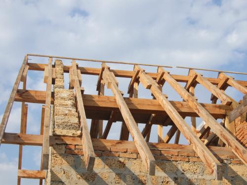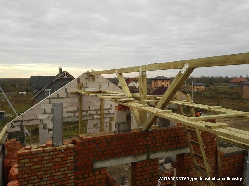 Далее, приступают к установке подкосов, распорок и других дополнительных компонентов каркаса крыши. В заключении делается обрешетка и проводится монтаж гидроизоляции, утеплителя и кровельного материала.