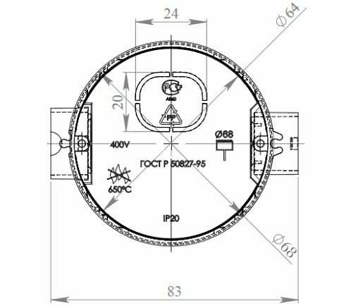 Диаметр — 64 мм, глубина — 42 мм. Степень защиты IP20. Крепежное расстояние 60 мм. Возможно соединение нескольких аналогичных подрозетников между собой с межцентровым расстоянием 71 мм. | |