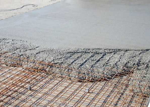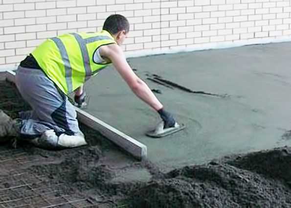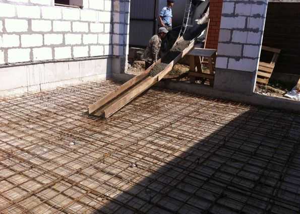Для приготовления бетона следует смешать в бетономешалке 1 часть цемента с тремя частями песка, четырьмя частями щебня и половиной части воды. Заливку следует начинать с угла, расположенного напротив двери. За раз необходимо наполнять несколько «карт» выравнивая поверхность лопатой и растягивая излишки смеси.