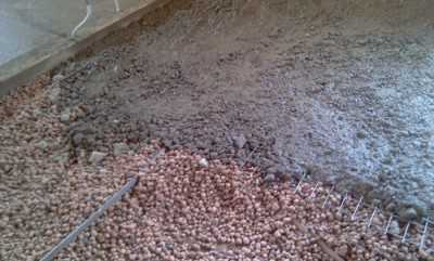 Укладка черновой стяжки по керамзиту: армирование выполнено сеткой-рабицей