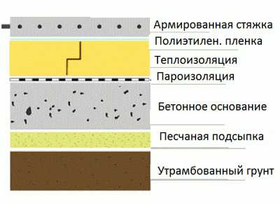 Вариант конструкция бетонного пола с планированием системы электрического или водяного теплого пола состоит из:
