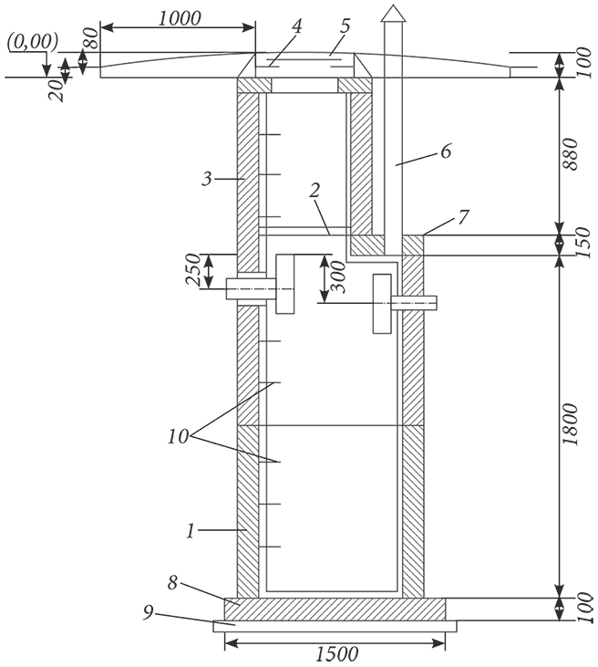 - классическая конструкция колодца (поступление стоков через верхнюю трубу, отвод через нижнюю),