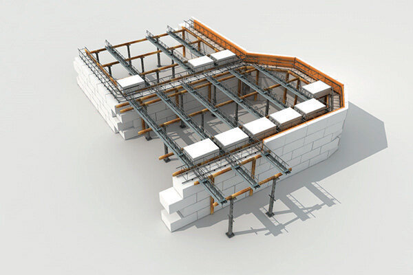 Количество и параметры балок рассчитываются индивидуально, исходя из размеров пролета перекрытия и предполагаемых нагрузок, средний шаг колеблется от 1,5 до 3 м, но каждый лист должен иметь три точки опоры — в центре и по горизонтали. края. Армирование однослойное — сетка, диаметр проволоки от 3 мм, шаг 200 × 200 мм, толщина защитного слоя по сетке не менее 15 мм.