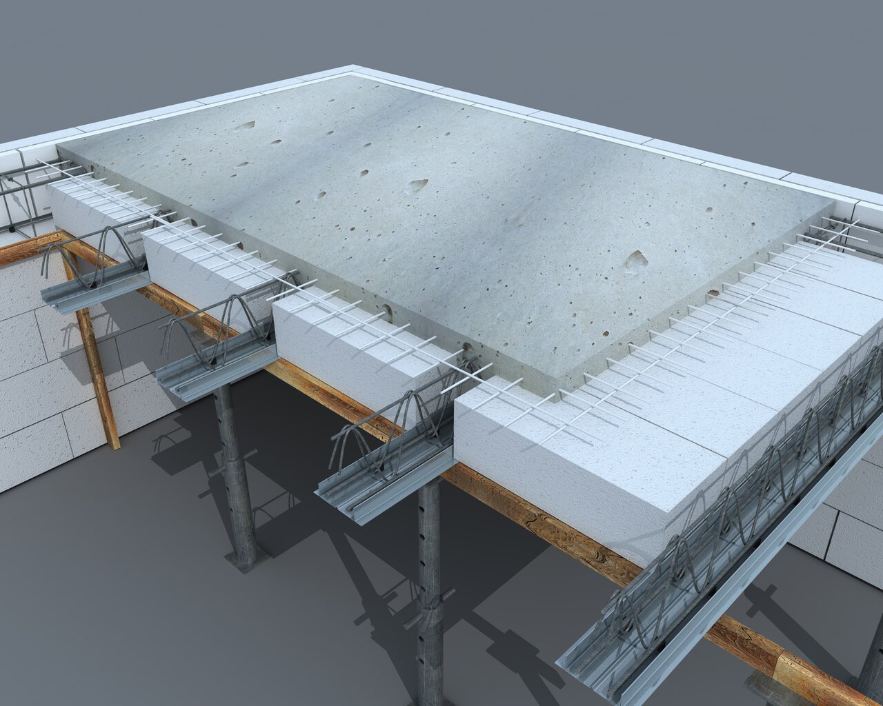 Опалубка обычно изготавливается из дерева, если используется однократно. Такие конструкции недолговечны, но просты в изготовлении и дешевые. Для многократного применения используют металлическую опалубку. Для крупного строительства применяется железобетонная опалубка. - Укладка смеси из бетона. Заливка бетонной смесью происходит после установки арматуры. Готовый бетон распределяется по всей конструкции. Процесс укладки бетонной смеси производится под четким надзором, при появлении дефектов работы приостанавливаются для их устранения.