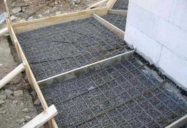 Для усиления конструкции берется металлическая сетка с размерами 50х50 (100х100 мм) и куски арматуры, зафиксированные в цоколе с шагом 0,75 м. Сетку поднимают над щебнем на 30 мм, а бетонную основу смешивают и заливают самостоятельно.