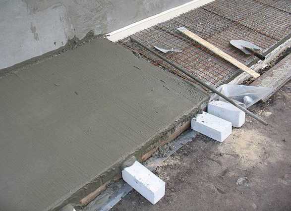 На этапе армирования необходимо не допускать появления воздушных карманов в бетоне. Для этого следует придерживаться тех пропорций, которые задействуются при производстве бетона для укладки дорог. В качестве готовой смеси используется цемент марки М400 и выше.