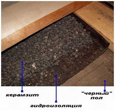 Потолочное перекрытие укрывают гидроизоляционной мембраной, сверху насыпают слой гранулированного керамзита толщиной не менее 25 см. Далее снова прокладывают гидроизоляцию в виде полиэтиленовой пленки или рубероида, для фиксации покрытия используют строительный степлер.