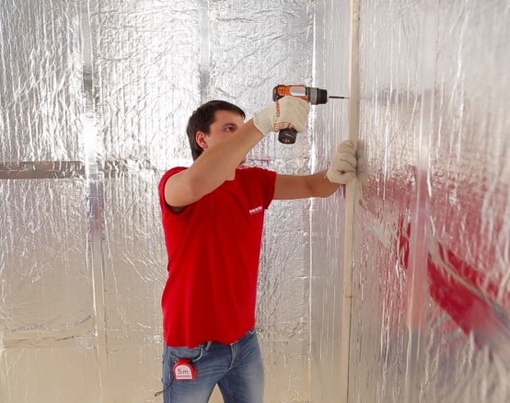 Первое, что необходимо сделать — это прогрунтовать стены и выровнять их. Конечно, рассчитывать на идеально ровную поверхность не стоит, да и задачи такой перед мастерами нет — мелкие погрешности закроет материал. После того, как стены подготовили к последующим работам, по всей площади поверхность закрывают гидроизоляционным материалом, дабы влага с наружной стороны дома не проникала в термо-материал. На эту обшивку устанавливают каркас, сформированный из металлических реек или их деревянных аналогов — по желанию владельцев квартиры. При подборе межреечного расстояния, ориентироваться надо прежде всего на ваш утеплитель. Рулон или лист материала должен быть немного шире, нежели расстояние между рейками. Очень важно, чтобы именно термоизолятор заполнил образовавшиеся ниши максимально плотно. Важно, чтобы образовавшаяся ниша была полностью заполнена материалом, если есть необходимость, его укладывают в два слоя.