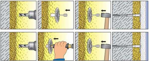 По истечении суток для придания надежности соединению плит и стен делается дополнительное закрепление утеплителя дюбелями с расширенной шляпкой (типа «грибок») по 1-2 в центре и 4 в углах с захватом четырех матов по соседству. Это крепление подойдет для любого типа минеральной ваты и поможет снизить ее деформацию.
