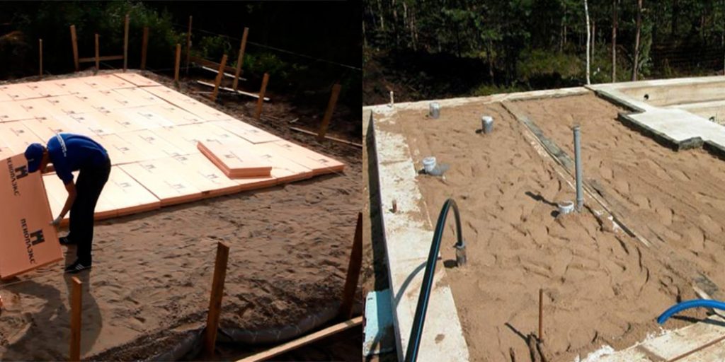 Утепление на этапе строительства предполагает укладывание утеплителя на грунт перед заливкой бетона.