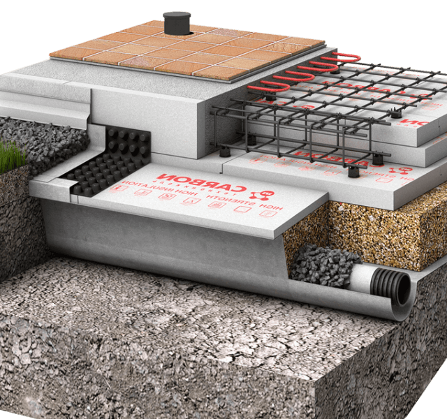 - Монолитная плиточная конструкция. Выполняется утепление фундаментной плиты не только снизу, но и по бокам.