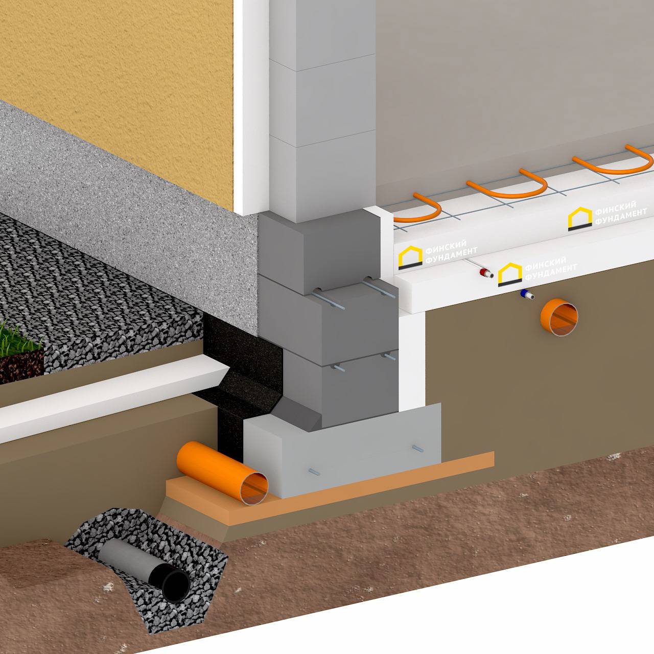 Утепленный финский фундамент — комбинированное железобетонное основание с комплексным утеплением и гидроизоляцией. Такой фундамент идеально подходит для строительства энергоэффективных зданий. Специфическая конструкция позволяет применять УФФ на участках с неровным рельефом или высоким уровнем залегания грунтовых вод. К недостаткам финского фундамента относят высокую стоимость и трудоемкий процесс монтажа. Однако эти минусы в полной мере компенсируются, так как при соблюдении технологии монтажа УФФ прослужит очень долго, и позволит существенно снизить затраты на обогрев дома.