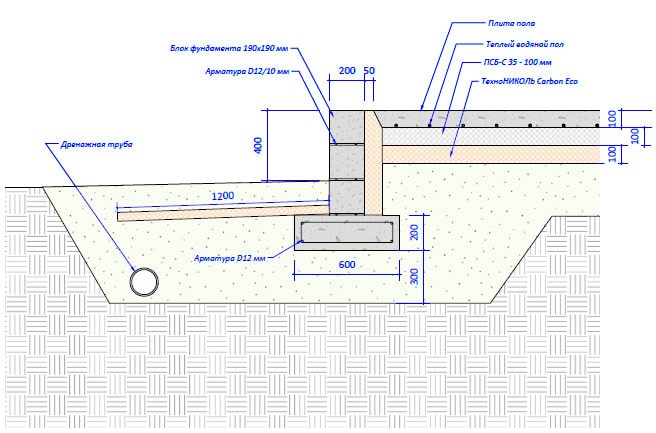 В качестве подошвы для УФФ предусмотрена железобетонная лента с сечением 600×200 мм.