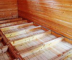 Заподлицо с низом балок вдоль них крепится брус с примерным сечением 50×50. Этот погонаж является опорой для «чернового пола» — досок, на которые выкладывается листовая гидроизоляция и первый слой утепления. Чаще всего используется минеральная вата. Поверх балок перпендикулярно им крепятся лаги. Между лагами выкладывается второй слой термоизоляции.