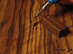 Зачистите дефект. Расплавьте при помощи горелки специальную шпаклёвку. Нанесите её на дефект и сразу же удалите излишки, попавшие на поверхность ламината рядом со сколом. Дайте застыть, отшлифуйте и отполируйте.
