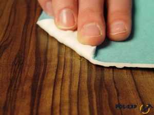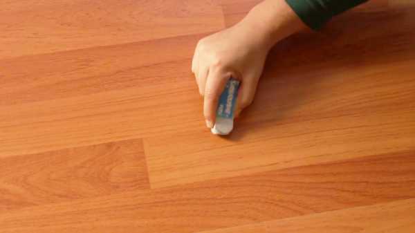 Вначале поврежденный участок ламината нужно тщательно очистить от пыли, а затем обработать пастой и карандашом — средство наносят до тех пор, пока углубление не будет полностью заполнено. Потом ламинат нужно отполировать сухой мягкой тряпочкой без ворсинок.