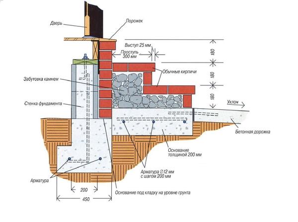 Варианты конструктивных решений узла примыкания кладки на ленточный фундамент представлены на рис. 1, 2 и 3.
