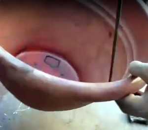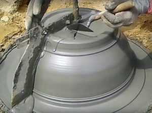 Далее, смешав цемент с водой, готовим раствор, похожий на жидкую сметану. Вращая форму наливаем в нее небольшой струей разведенный цемент так, чтобы вся поверхность была покрыта этим раствором. Он должен растекаться самостоятельно.