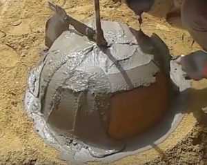 Настал момент, когда можно начинать выкладывать внутреннюю поверхность формы заранее приготовленной цементной смесью (1ч. цемента + 2ч. песка). Для этого используем лопатку или мастерок. Цементная смесь должна быть густой и похожей на творог. Выкладываем сначала дно, а затем края движением снизу вверх.