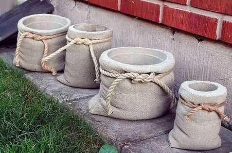 На мысль о том, как сделать и как будет смотреться в саду бетонная ваза из мешковины, натолкнула найденная в интернете фотография четырех бетонных вазонов.