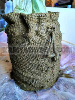 Третий вариант. Как и в первом варианте сначала хорошо пропитываем в цементном растворе саму мешковину. Затем вставляем в нее полиэтиленовый мешок. В мешок насыпаем влажный строительный песок. Подсыпая и утрамбовывая песок, засыпаем мешок полностью. Завязываем мешок веревкой. В таком состоянии оставляем сохнуть. Через пару дней, когда мешковина окаменеет, высыпаем песок и вынимаем полиэтиленовый мешок. Далее готовим бетонный раствор (как в предыдущих вариантах), заливаем его в застывший мешок и вставляем в раствор пластмассовое ведерко. Ждем, когда смесь застынет. Через пару дней вынимаем ведерко и бетонная ваза из мешковины готова.