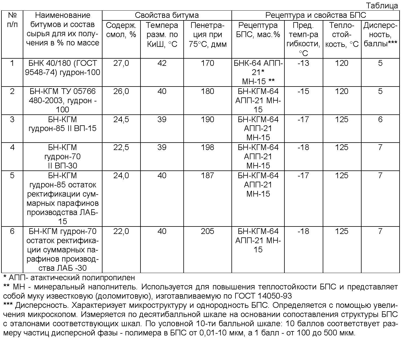 Другие полимеры, применяемые для модификации битума (например, атактический полипропилен — АПП), также позволяют добиться высокой теплостойкости, но не обеспечивают столь высокой гибкости при низких температурах. Подбор полимера для модификации битума осуществляют исходя из назначения материала, условий его монтажа и эксплуатации.