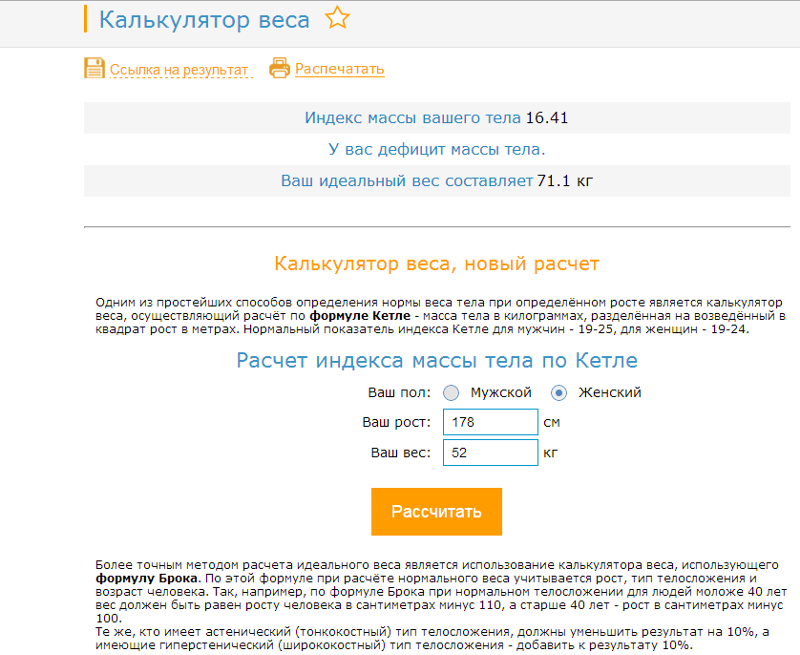 Обратите внимание, что для особо высоких или невысоких людей будет актуален только последний результат (BBMI).Другие ограничения для людей любого роста включают в себя: Без учета этнической принадлежности, возраста или соотношения жира и мышц. На самом деле, этот калькулятор идеального веса предназначен только для интересов, а не для людей в целях здоровья.