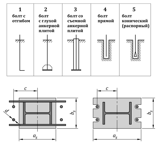 Одни из самых первых анкерных болтов были предназначены только для установки в фундамент. В настоящее время их выпускают 6 типов длиной до 5 м и диаметром до 140 мм. Монтируют эти фундаментные болты так: