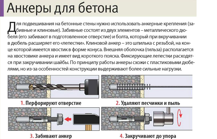 Исходя из этого и подбираете оптимальный крепеж по диаметру и длине, в зависимости от веса конструкции, чем тяжелее, тем толще и длиннее анкер.